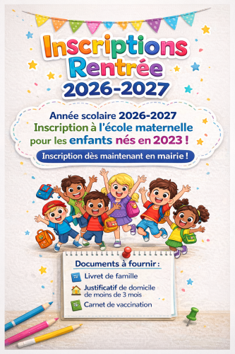 Les inscriptions pour la rentrée 2026 sont ouvertes. Si votre enfant est né en 2023, il est temps d’effectuer son inscription à l’école. Rendez-vous au secrétariat de la mairie.